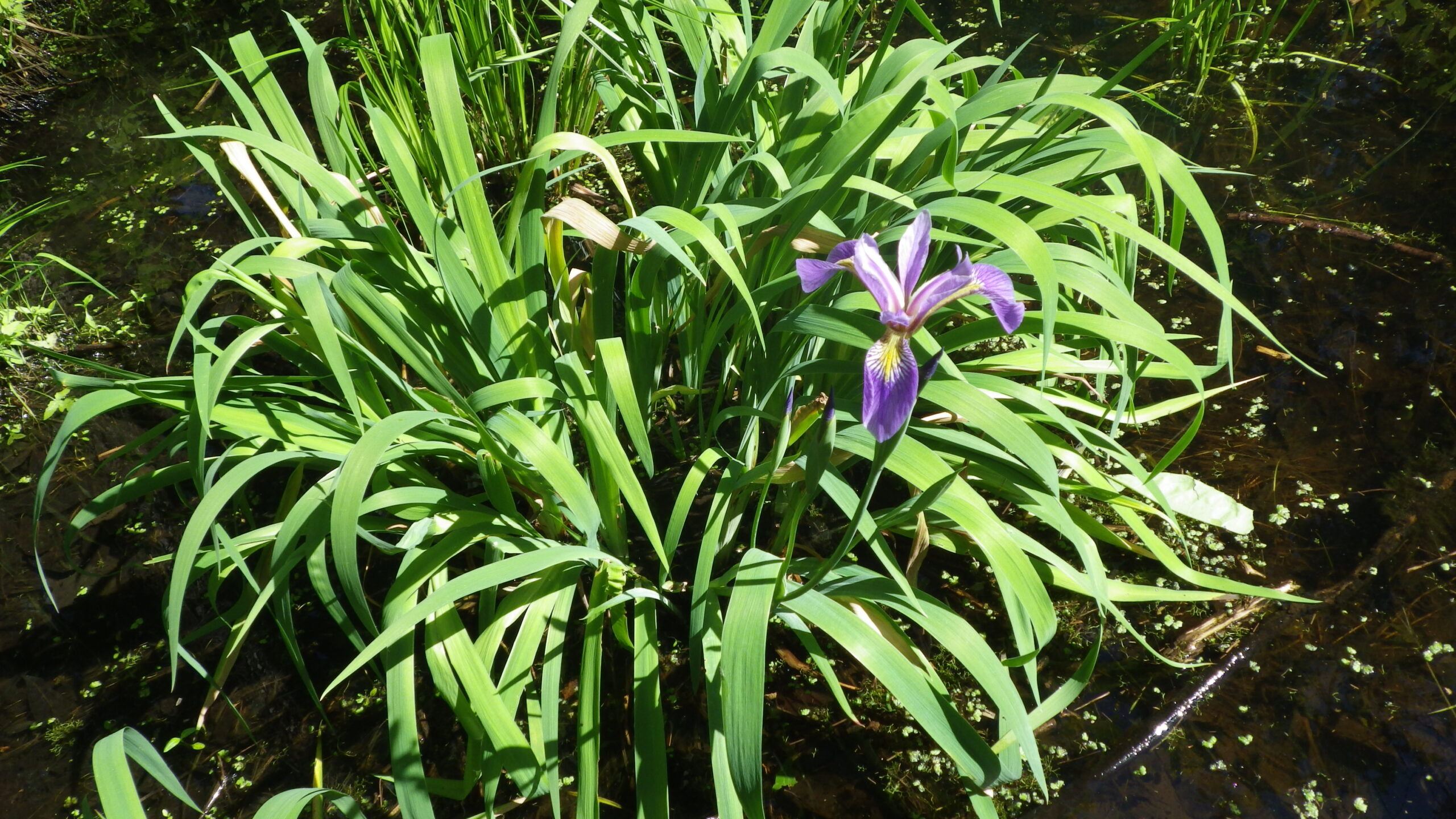 Plante herbacée vivace à tige variant de 15 à 90 cm de hauteur, l’iris versicolore pousse en touffes denses et forme des colonies. Elle se distingue par ses longues feuilles dressées et ses fleurs spectaculaires. Celles-ci présentent de larges sépales bleu violacé ornés de jaune et de blanc à la base (4 à 7 cm), tandis que les pétales, plus petits, mesurent de 2 à 5 cm. La floraison a lieu au printemps. On peut l’observer notamment le long du sentier No 4.