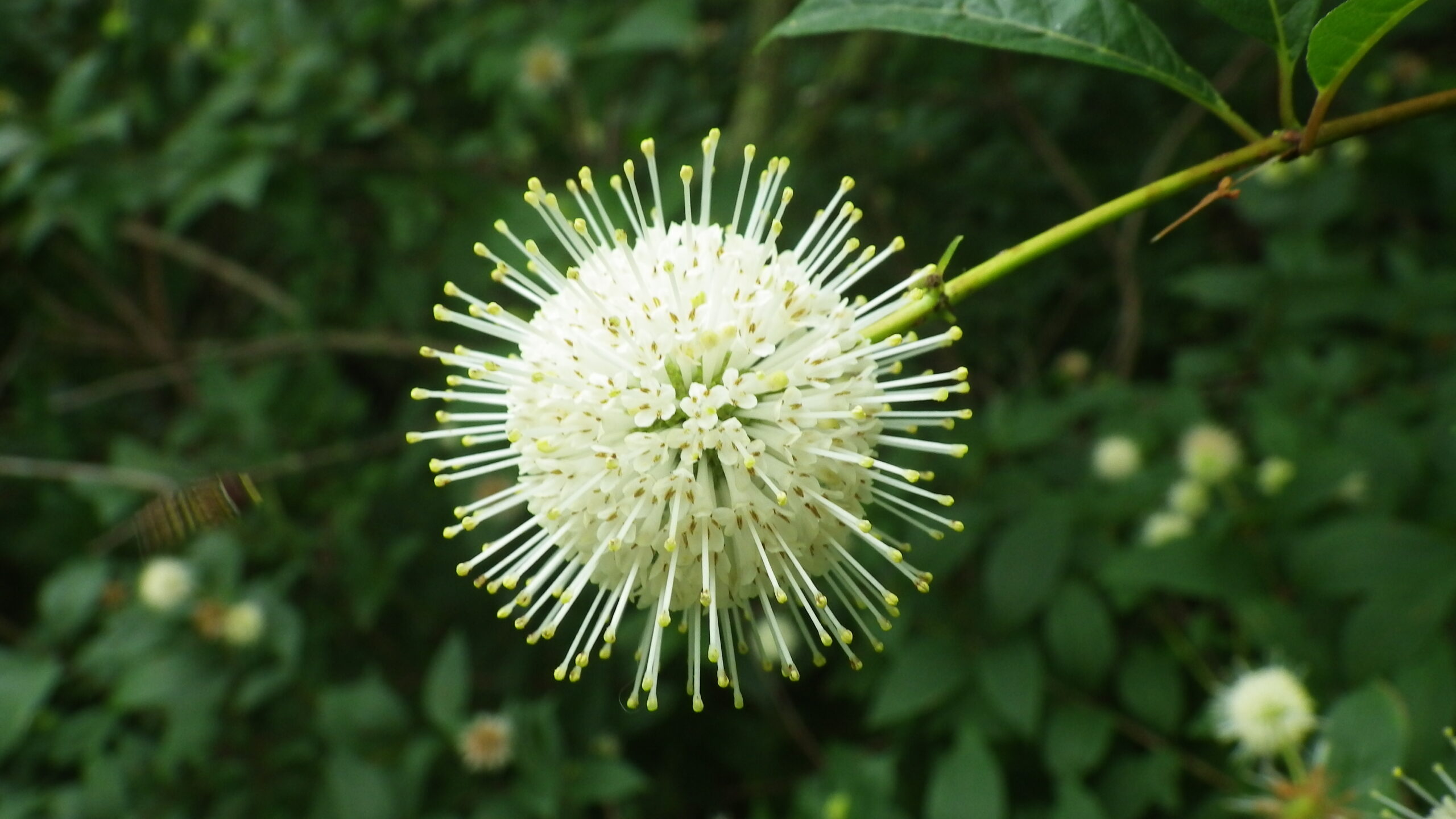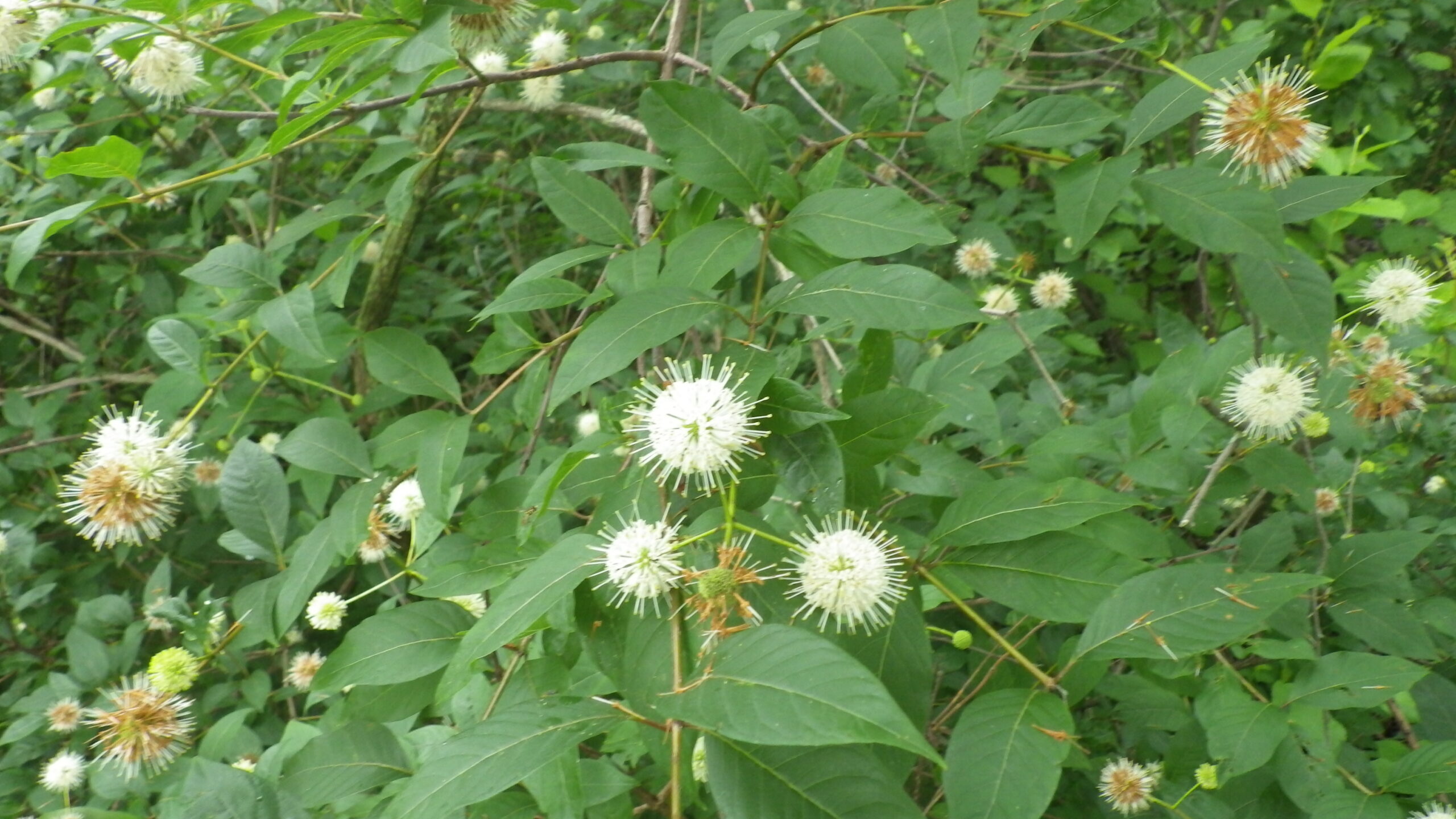 Arbuste (1-3 m) ; les feuilles sont ovales, opposées ou verticillées par 3. Fleurs blanches formant des boules sur de longues tiges (pédoncules). Floraison estivale. Marécage et rives des cours d’eau. Peu commun.