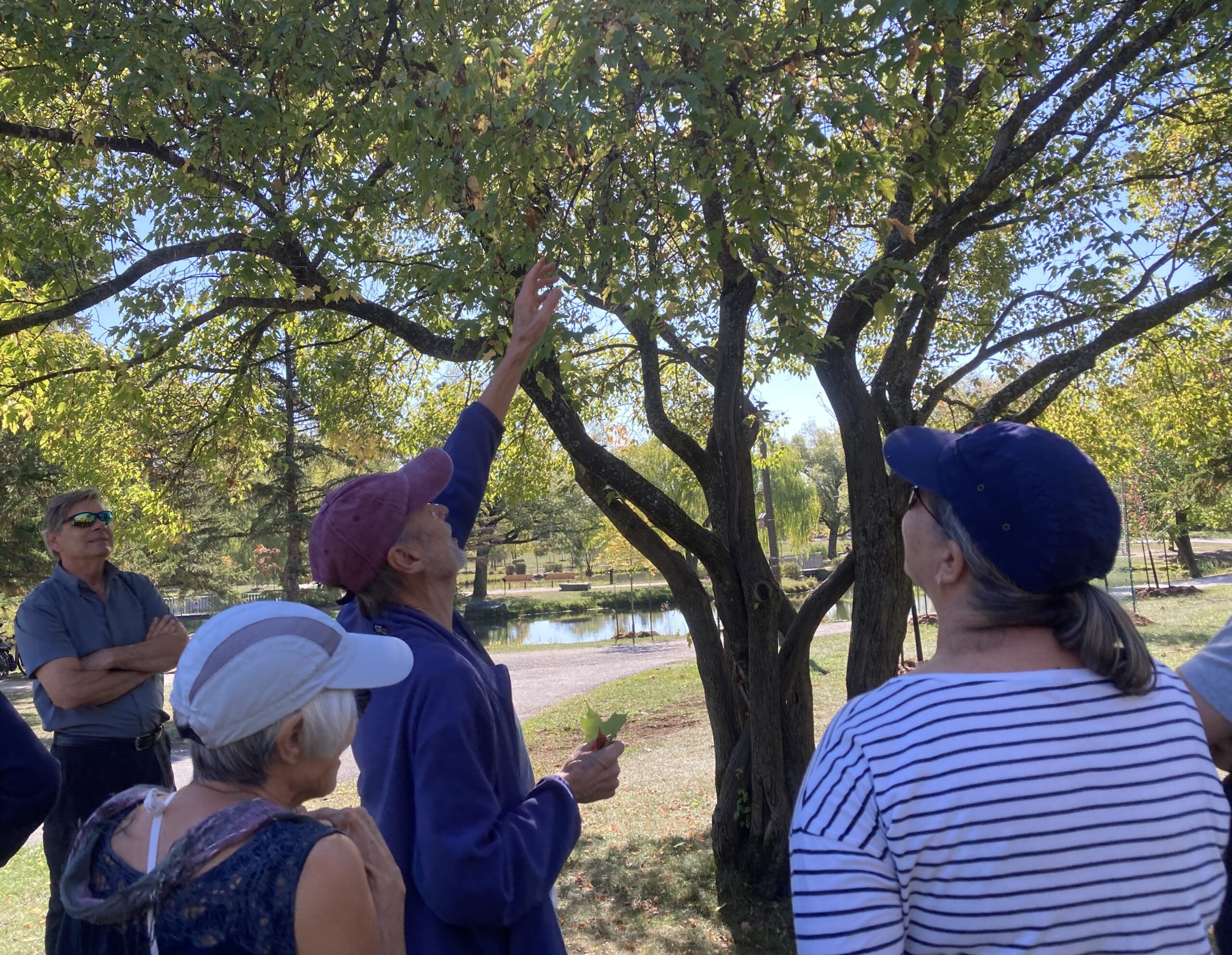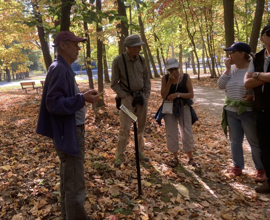 Une douzaine de personnes ont découvert une quinzaine d’espèces d’arbres du parc avec le botaniste amateur Denis Sabourin (au centre). Un autre bénévole de longue date, Jacques Savard (extrême gauche), a souligné des interventions des APMC et de la Ville de Longueuil qui visent à préserver la biodiversité du par cet a présenté quelques éléments de l’histoire du parc.